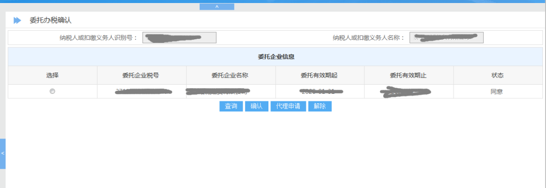 在“委托企业信息”界面选择委托企业,并录入“授权码”点击“确定”按钮完成登录。系统自动进入委托企业的办税界面。