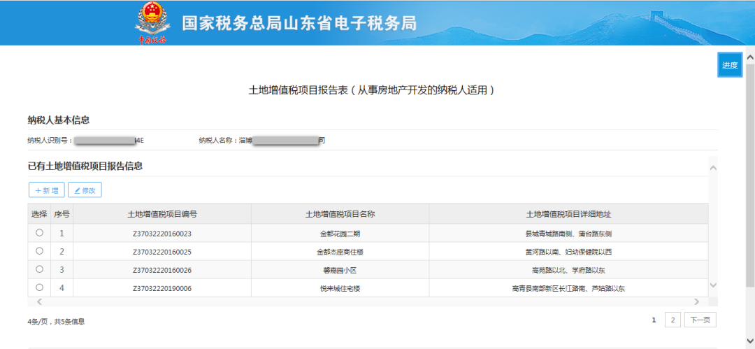 点击“土地增值税项目报告表(从事房地产开发的纳税人适用)”功能,进入土地增值税项目报告表初始化界面,系统显示纳税人已有土地增值税项目报告信息,如下图: