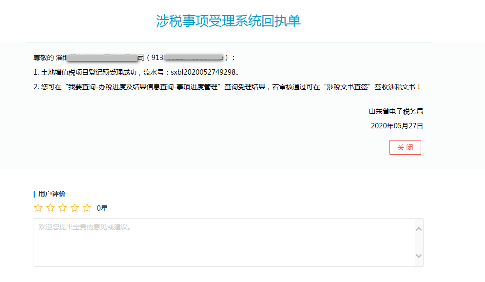 报表填写完成后,点击“下一步”按钮提交局端审核,系统显示事项受理回执界面。如下图: