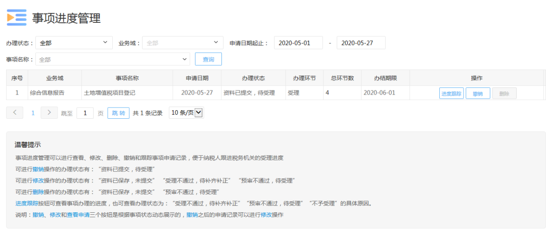 纳税人可通过“我要查询”-“办税进度及结果信息查询”-“事项进度管理”查询局端审核进度,如下图: