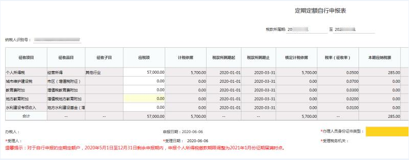 在“定期定额纳税人申报”模块,定期定额自行申报表中增加个人所得税延缓缴纳功能,系统在表格下方添加温馨提示以告知此项调整信息。