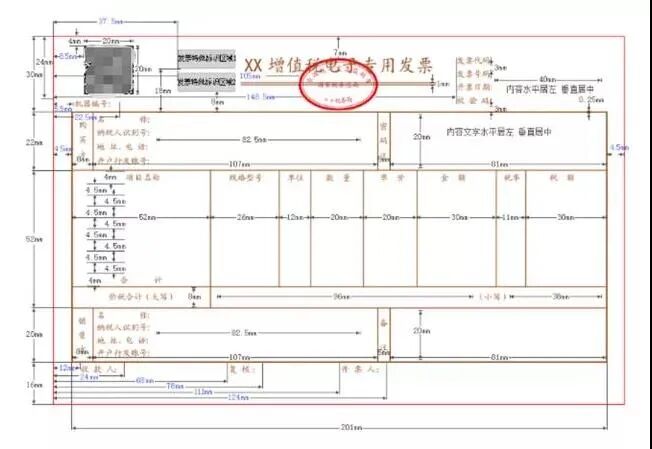 电子专票纵向分为票头、购买方、应税明细和合计、销售方和票尾五个部分,高度分别为30、22、52、20和16毫米。不包含票头、票尾的内框尺寸为201*94毫米。