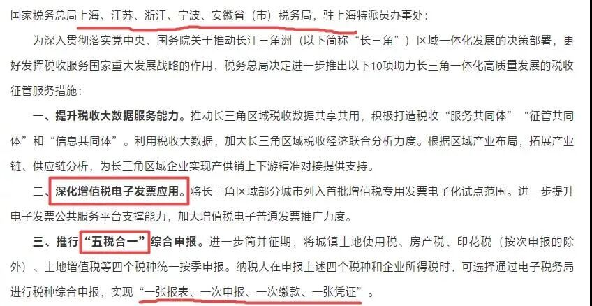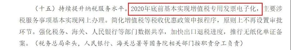 其中明确提到:2020年底前基本实现增值税专用发票电子化,主要涉税服务事项基本实现网上办理。简化增值税等税收优惠政策申报程序,原则上不再设置审批环节。强化税务、海关、人民银行等部门数据共享,加快出口退税进度,推行无纸化单证备案。(税务总局牵头,人民银行、海关总署等国务院相关部门按职责分工负责)